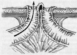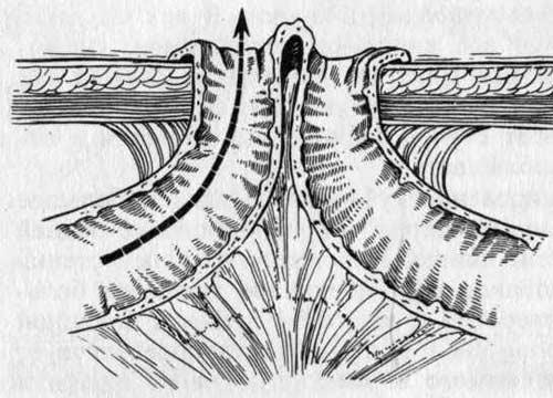 В утворенні та функціонуванні губоподібних нориць велике значення має так звана „шпора" - випинання задньої стінки нориці через її отвір. Вип'ячуванню задньої стінки сприяють підвищення внутрішньочеревного тиску, великі розміри норицевого отвору з наявністю дефекту черевної стінки, запальні процеси та рубці. Шпора перешкоджає попаданню кишкового вмісту у відвідну частину кишки та сприяє виділенню кишкового вмісту назовні. У зв'язку з тим, що нориця стає повною, весь кишковий вміст виходить назовні, у відвідній частині кишки розвиваються вторинні атрофічні та рубцеві зміни; в привідній частині - гіпертрофія, особливо виражена в м'язовому шарі кишки. Губоподібні нориці при консервативному лікуванні не гояться, тому їх ліквідовують хірургічним шляхом.
